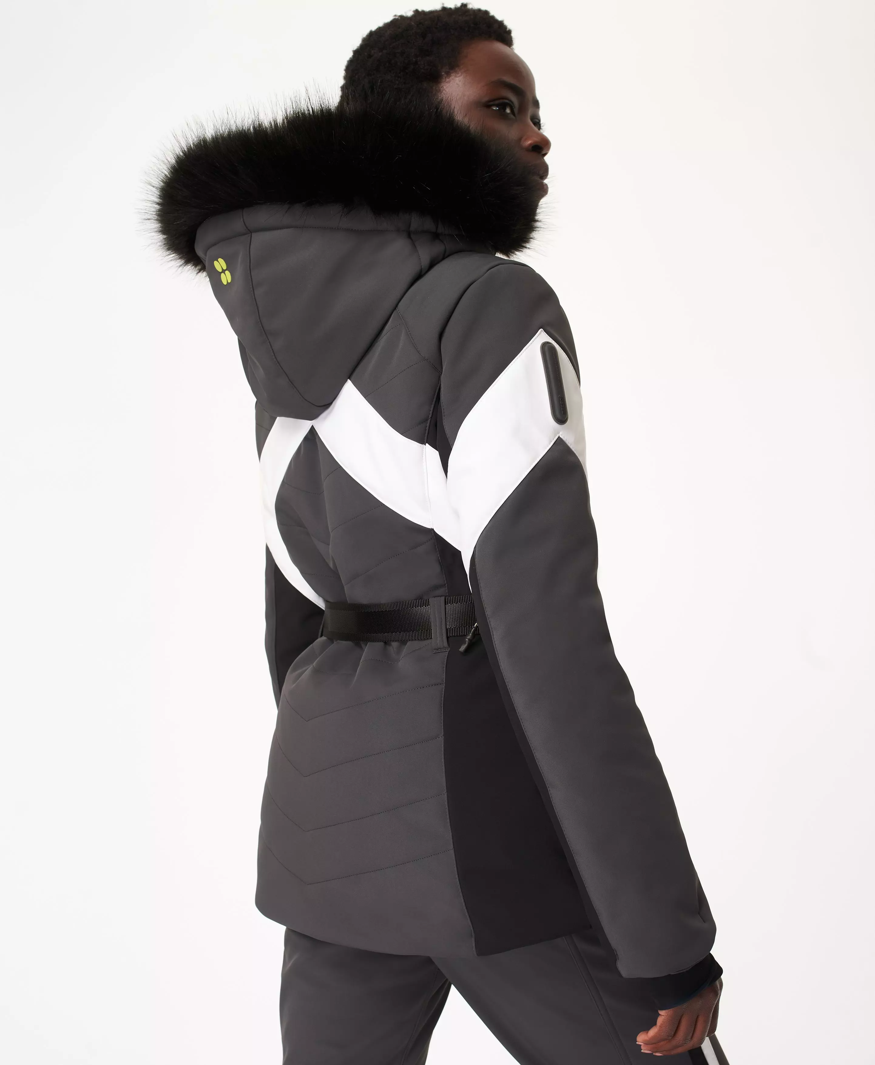 This grey sweaty betty method belted ski jacket has been padded with primaloft which is an insulated fabric made from recycled materials.
